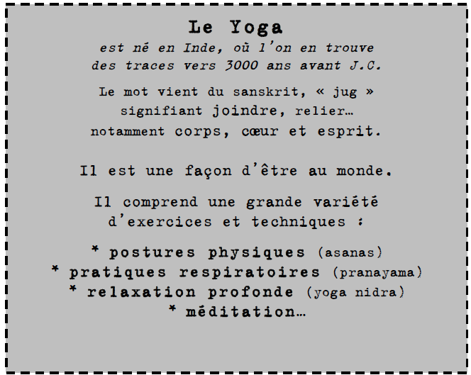 > techniques de yoga, en fonction des situations : quand on a du mal à se lever, à se mettre au travail, à trouver le sommeil..